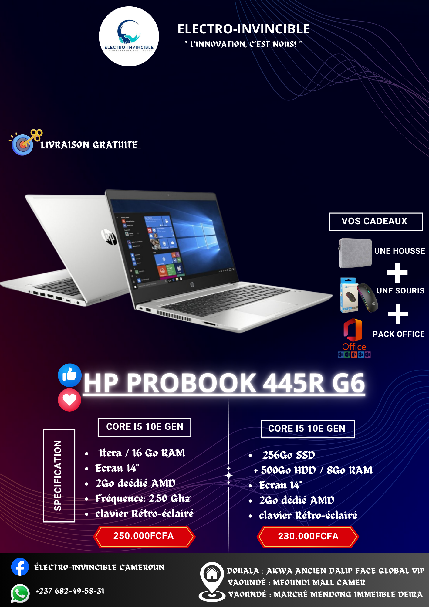 Le HP ProBook 445R G6 est un ordinateur portable professionnel 14″ offrant un excellent compromis entre performance, durabilité, sécurité et mobilité. Ce modèle est particulièrement adapté aux professionnels, PME, étudiants avancés et télétravailleurs qui ont besoin d’un appareil réactif et fiable pour leurs activités quotidiennes. Press HP